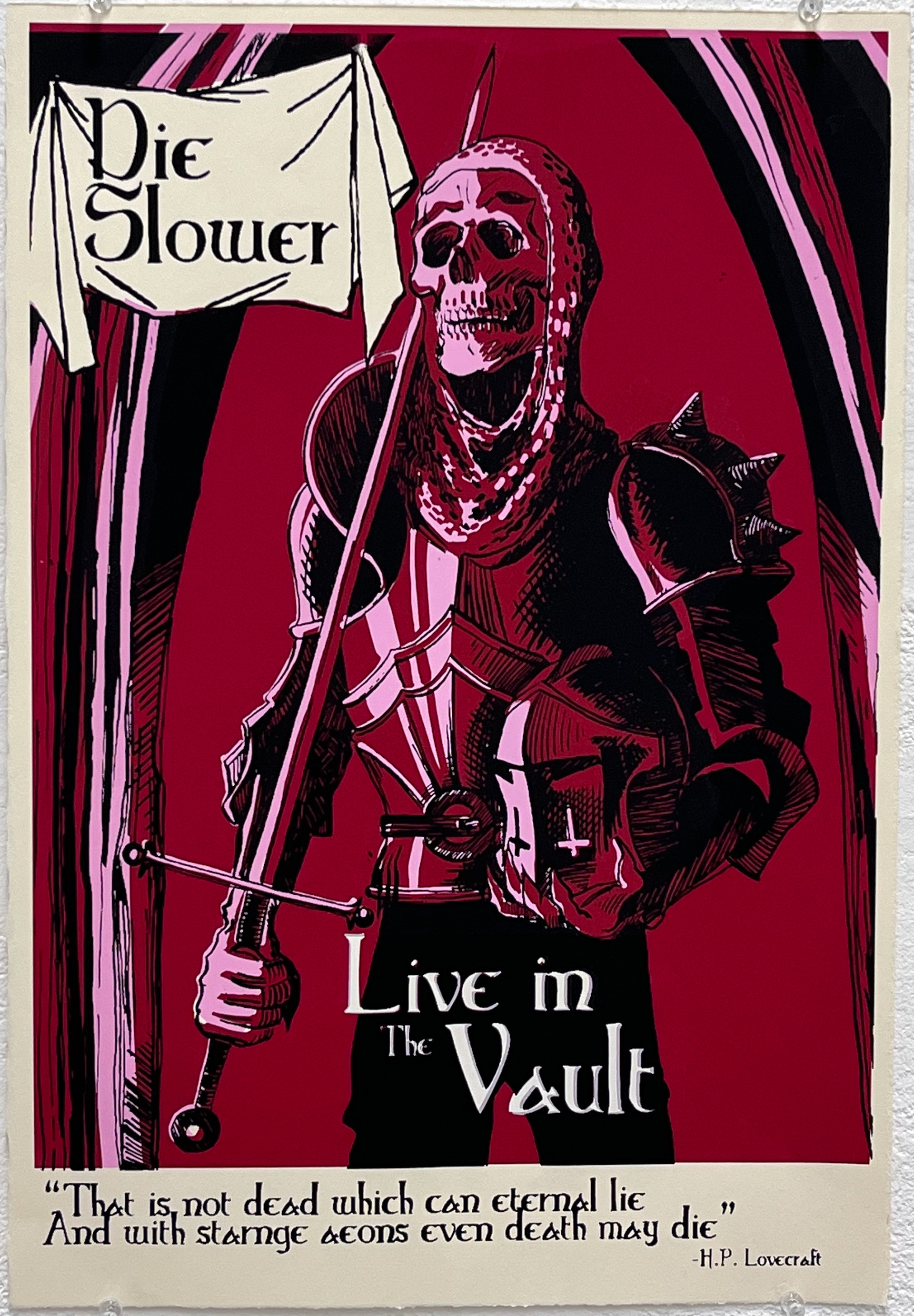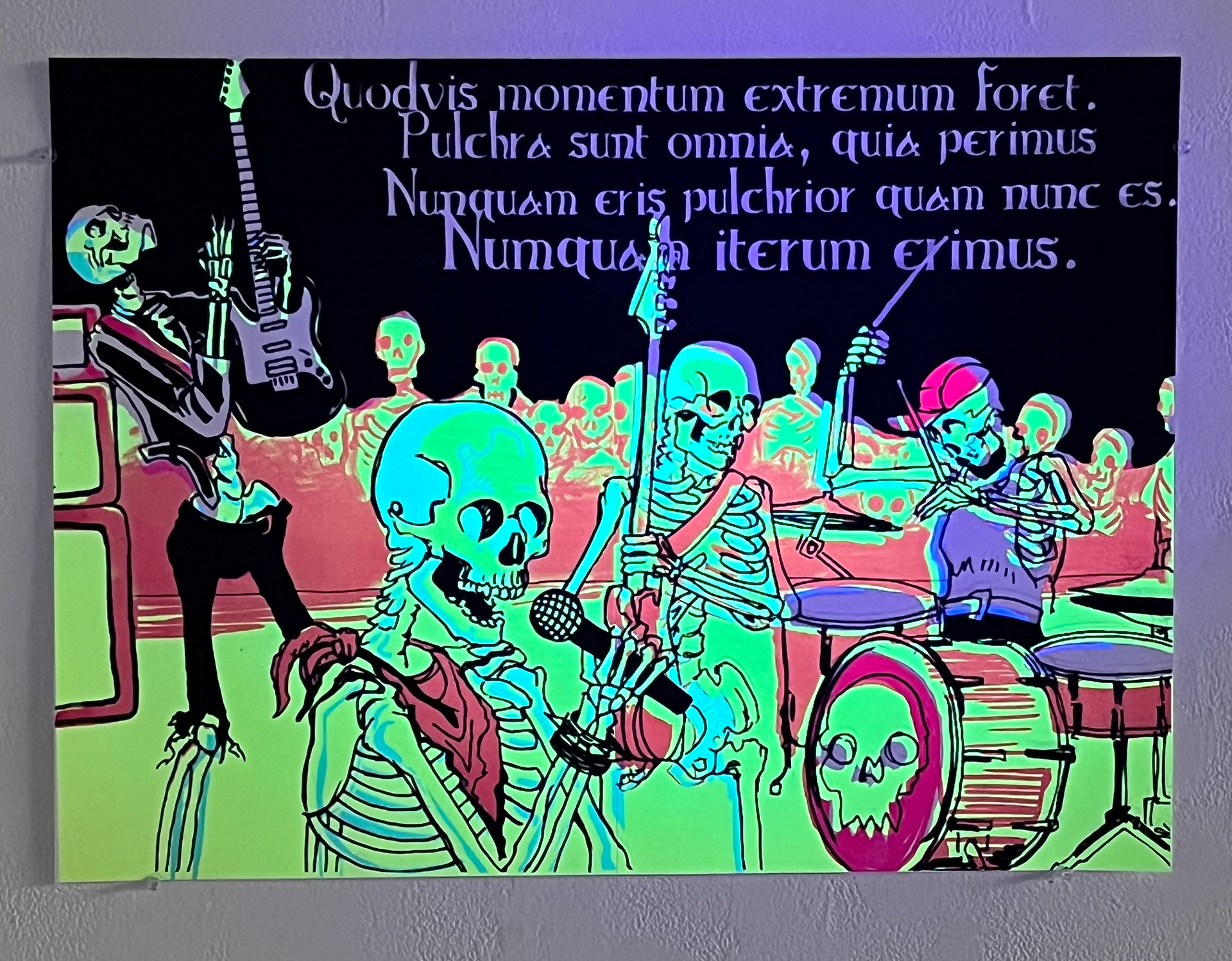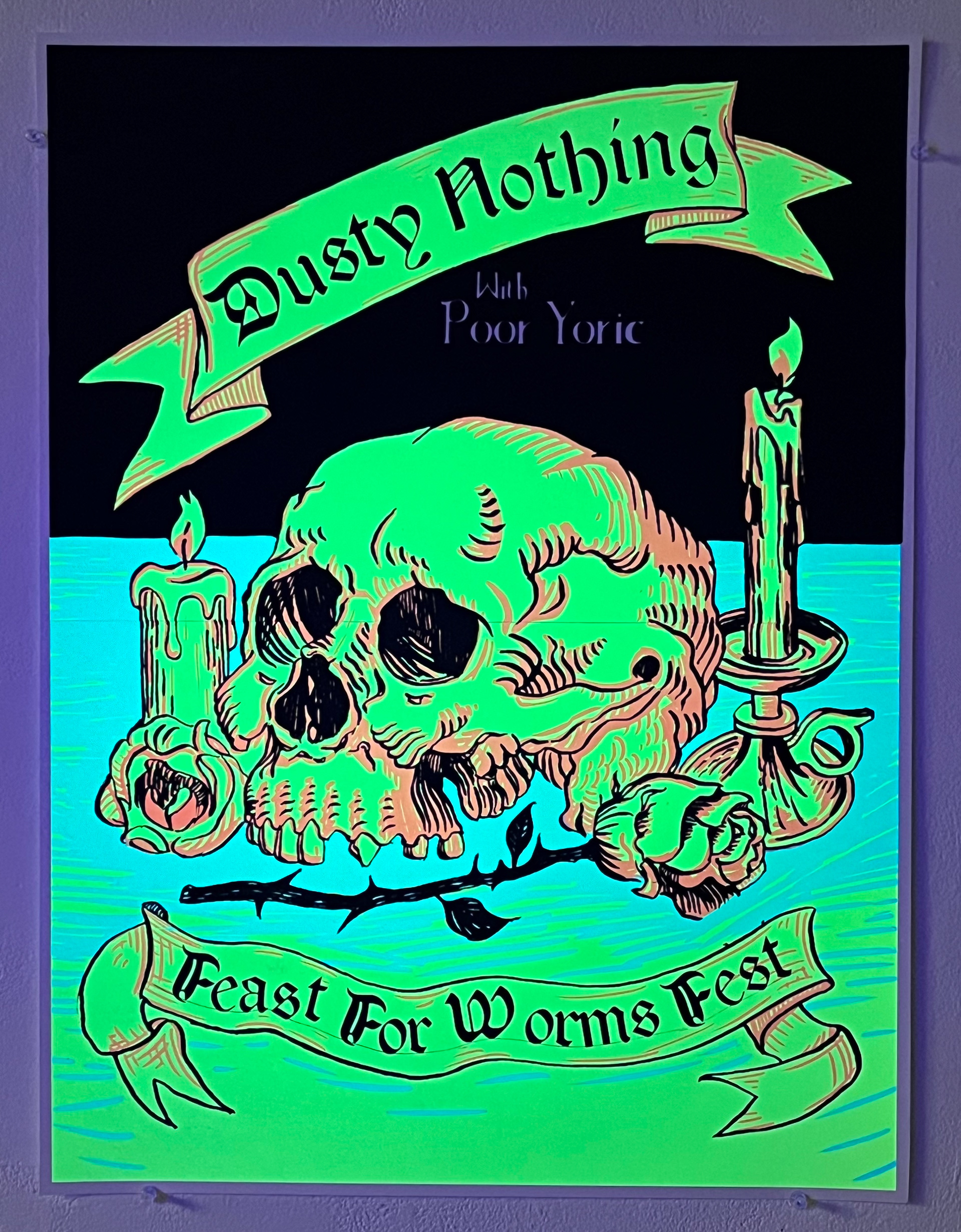 These silk screened images modernize traditional Momento Mori imagery in the guise of contemporary concert promotions and black light posters.